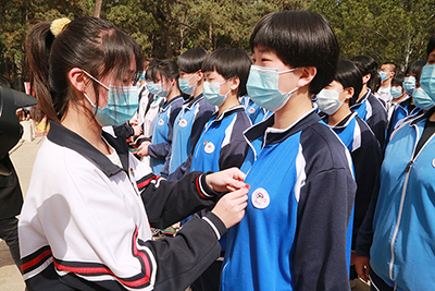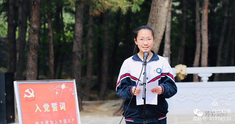 在鲜艳的团旗下,老团员代表为新团员颁发团章、团证并佩戴团徽。全体团员在团委副书记王桂春同志的带领下庄严宣誓:“我志愿加入中国共产主义青年团,坚决拥护中国共产党的领导,遵守团的章程,执行团的决议,履行团的义务,严守团的纪律,勤奋学习,积极工作,吃苦在前,享受在后,为共产主义事业而奋斗!”入团介绍人宣读了《团章》中有关团员的义务和权利的条款。天津市信息工程学校卢博同学和蓟州区第二中学周亚歆同学分别代表新老团员发言,表示将牢记共青团嘱托,奋发进取,发挥模范带头作用,努力让青春在奋斗中绽放光彩!
