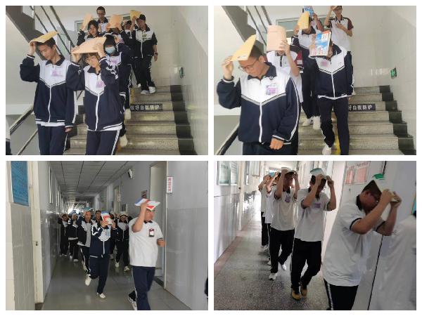 演练活动中,同学们在教师的引领下,用书本护住头部,沿着事先规定的疏散路线,有序撤离到各专业系指定集合位置。