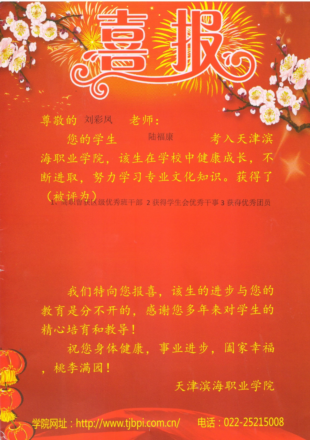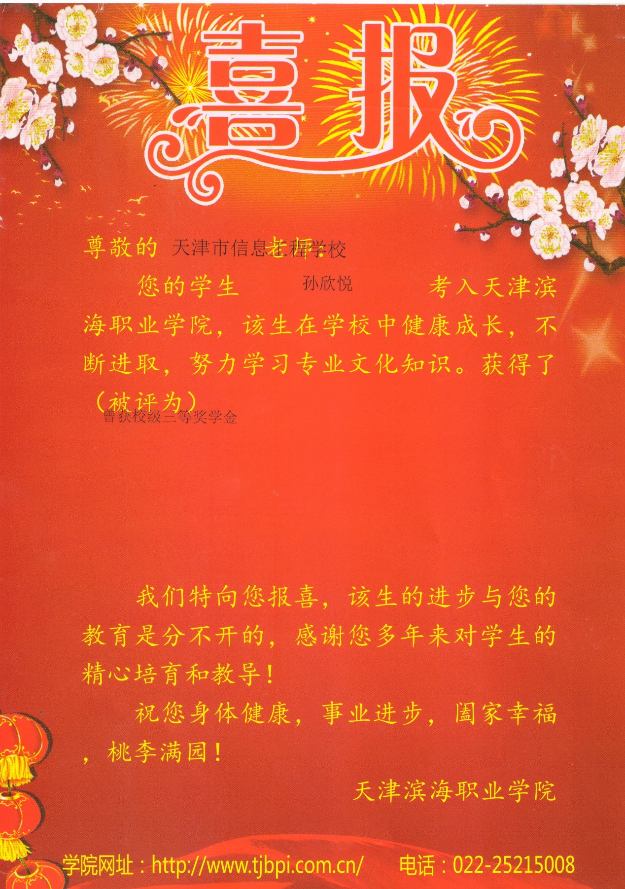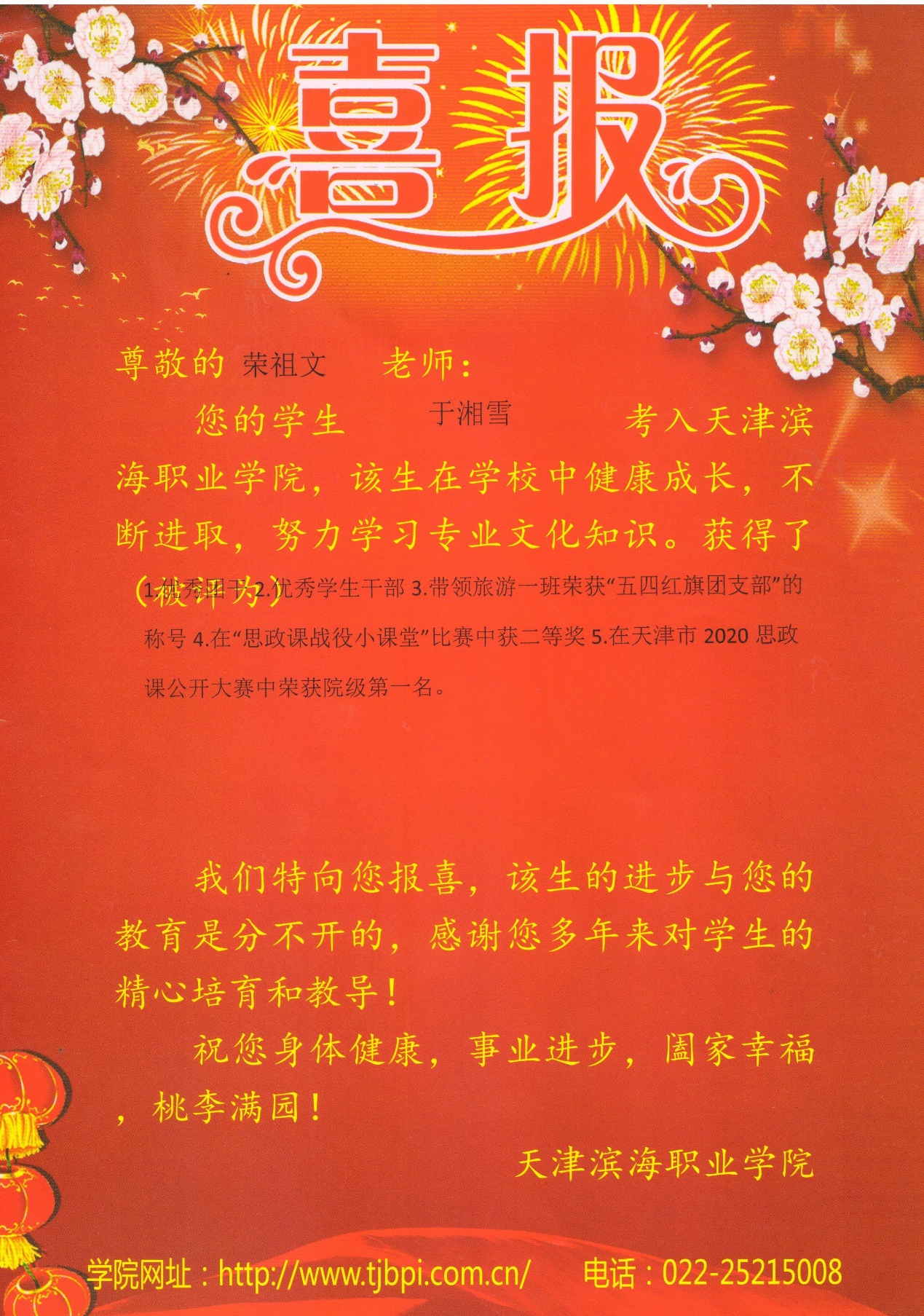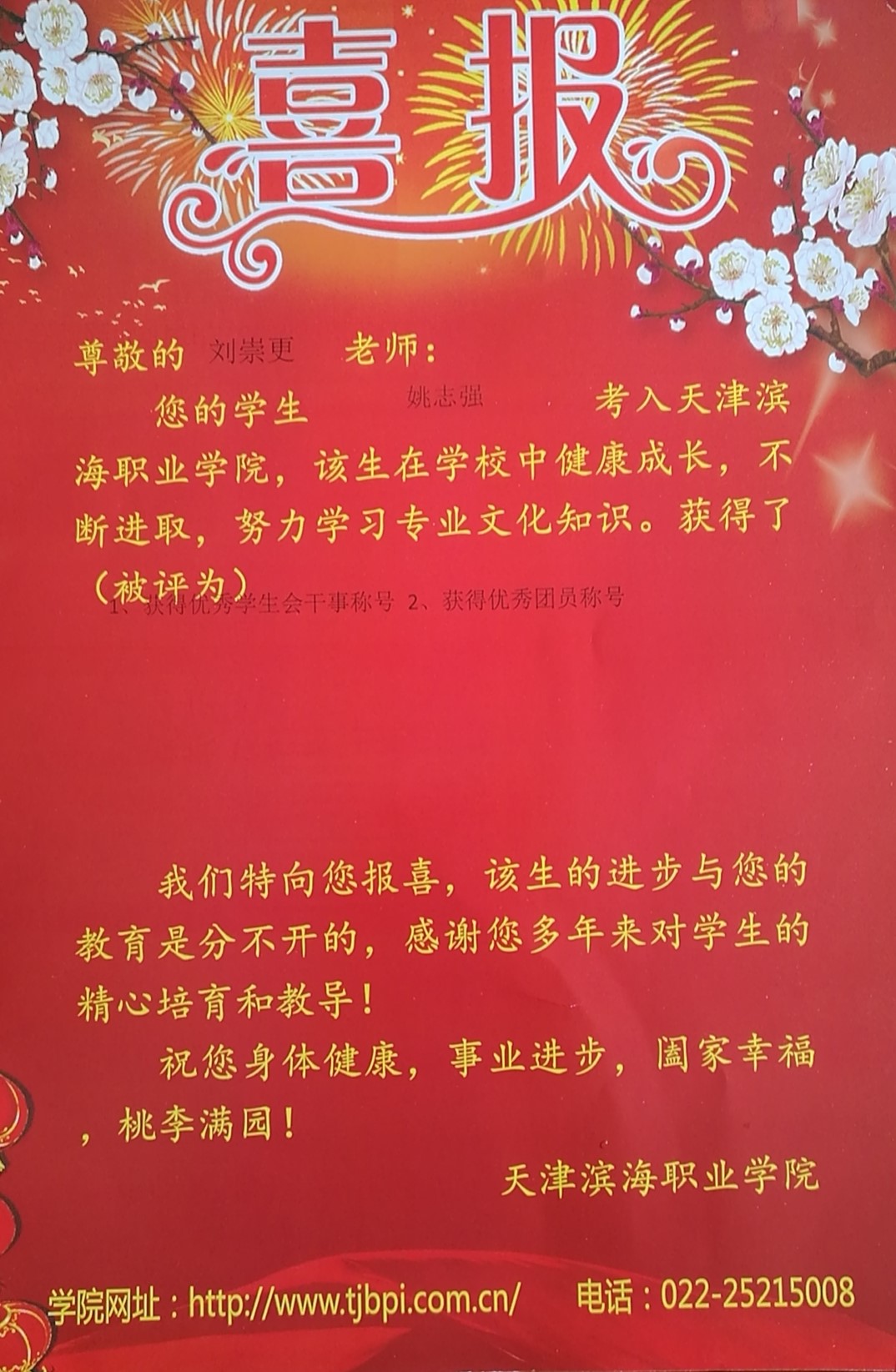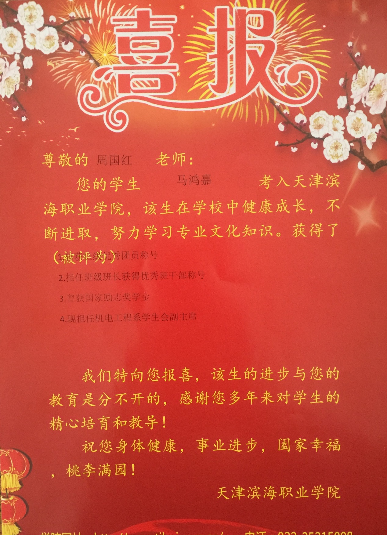 2021年4月12日,天津滨海职业学院因为我校毕业生在高职院校的优异表现给学校和班主任发来喜报,感谢学校和老师为高职院校培育了优秀学生。