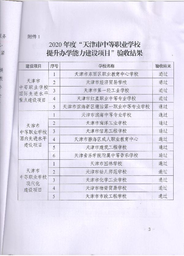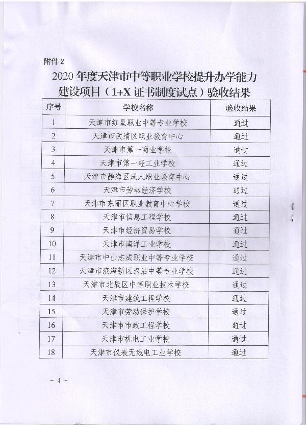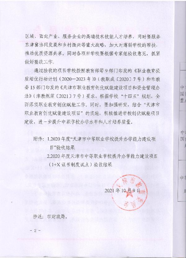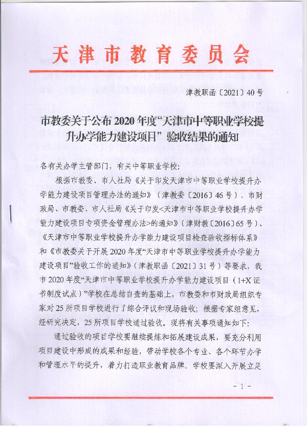 2021年10月9日,天津市教委公布2020年度“天津市中等职业学校提升办学能力建设项目”验收结果,我校“中等职业学校国内先进水平建设项目”和“‘1+X’证书制度试点建设项目”两项任务顺利通过市级验收。