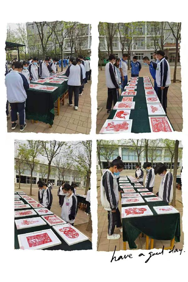 项目负责教师刘晓清老师为剪纸大赛做了大量的工作,付出大量的心血,对所有参赛作品进行前期指导和后期装裱,最终选出100幅作品于4月20日、21日在小树林进行展出。