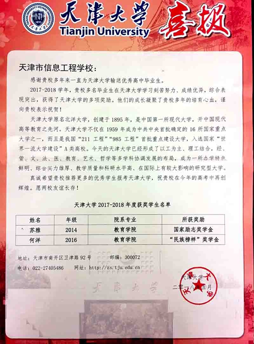 多年来,天津市信息工程学校春季高考的优异成绩一直被各录取院校所关注。6月4日,春季高考录取院校中最有影响力的天津大学向学校发来喜报,祝贺天津市信息工程学校多名毕业生在2017—2018学年,获得了天津大学的多项奖励,并衷心感谢天津市信息工程学校多年来一直为其输送优秀中职毕业生,同时真诚希望天津市信息工程学校推荐更多的优秀毕业生报考天津大学。